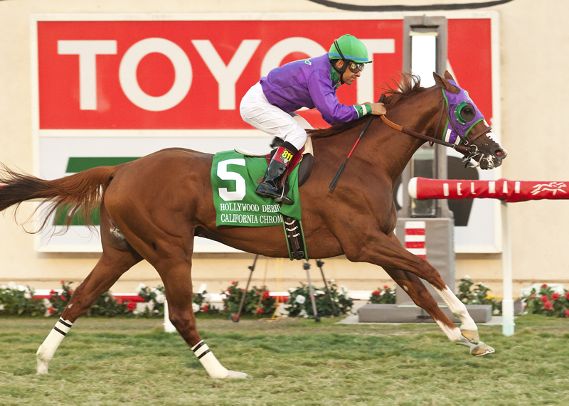 Showing a return to the form which propelled him to six straight victories this year, California Chrome and regular rider Victor Espinoza won the Hollywood Derby by two lengths, with the star filly from Canada, Lexie Lou, finishing second. Talco was third, a length behind the runner-up. Sawyer’s Hill faded to fourth in the field of six three-year-olds. Completing the order were Cabral and Flamboyant.